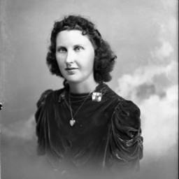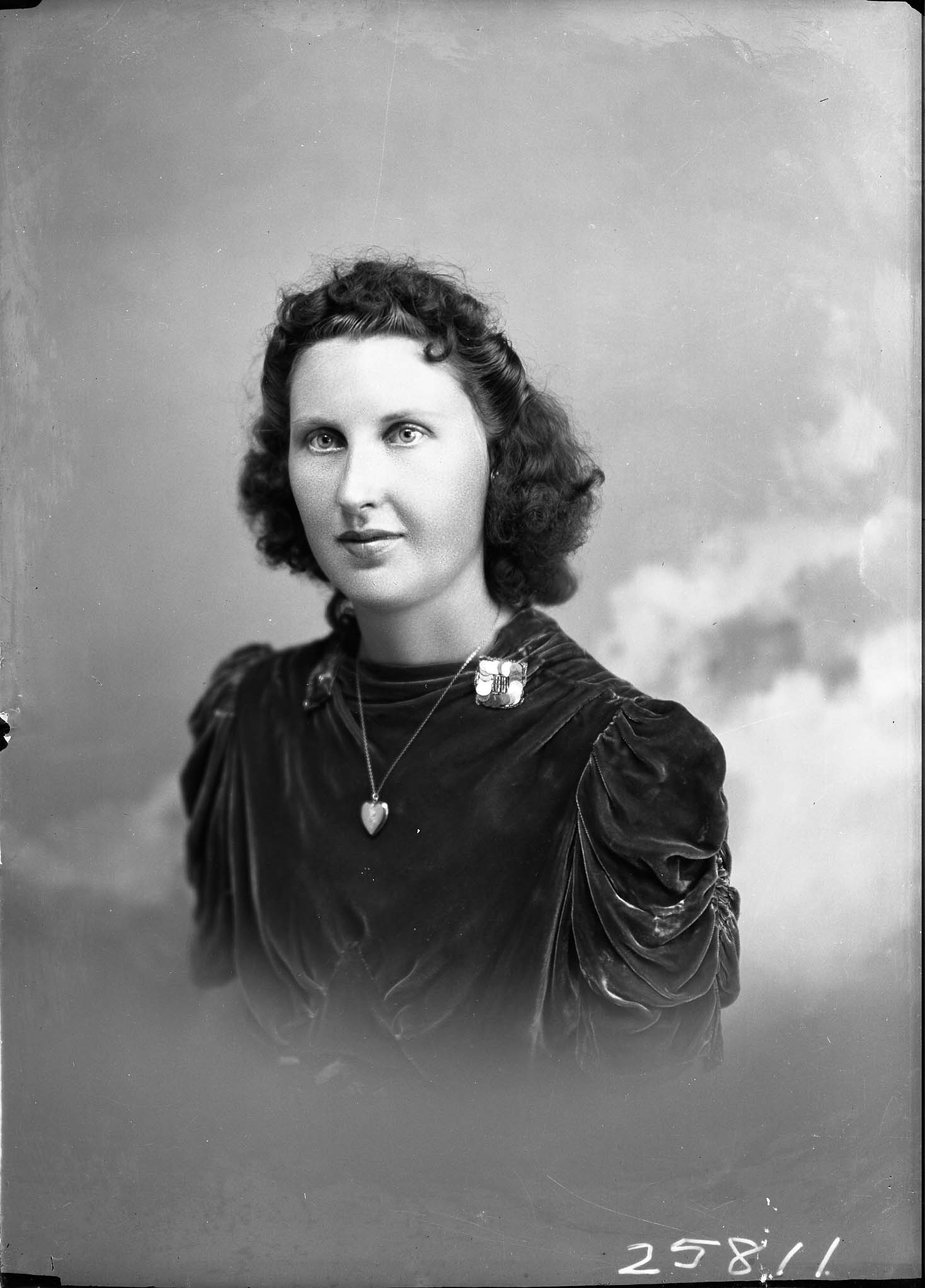 Portrait photograph of an unidentified young woman with short curly hair and wearing a heart necklace and pin with her dress.