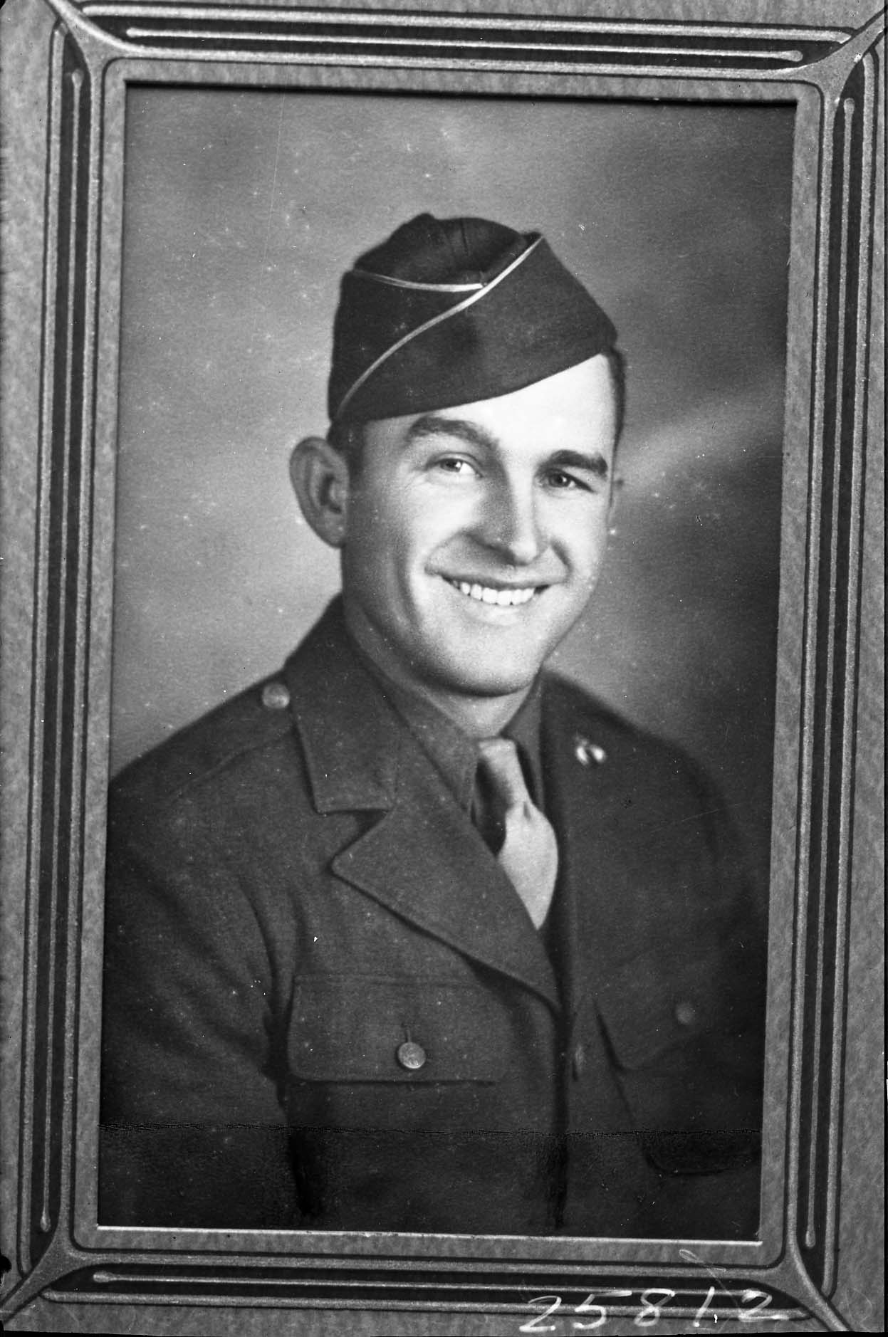 Photo of a framed portrait photograph of an unidentified man wearing an army uniform.
