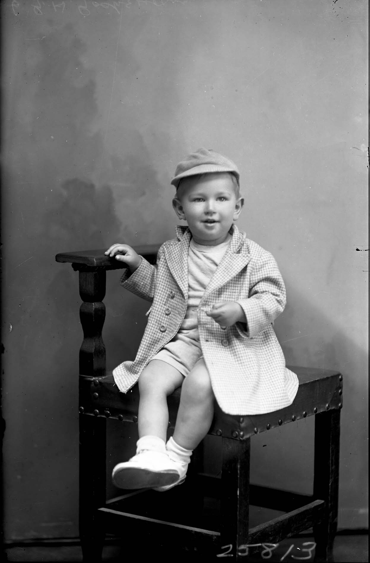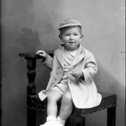 Unidentified young boy is seated on a chair with his ankles crossed and wearing a checkered coat and cap.