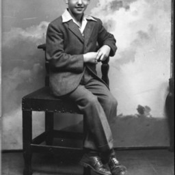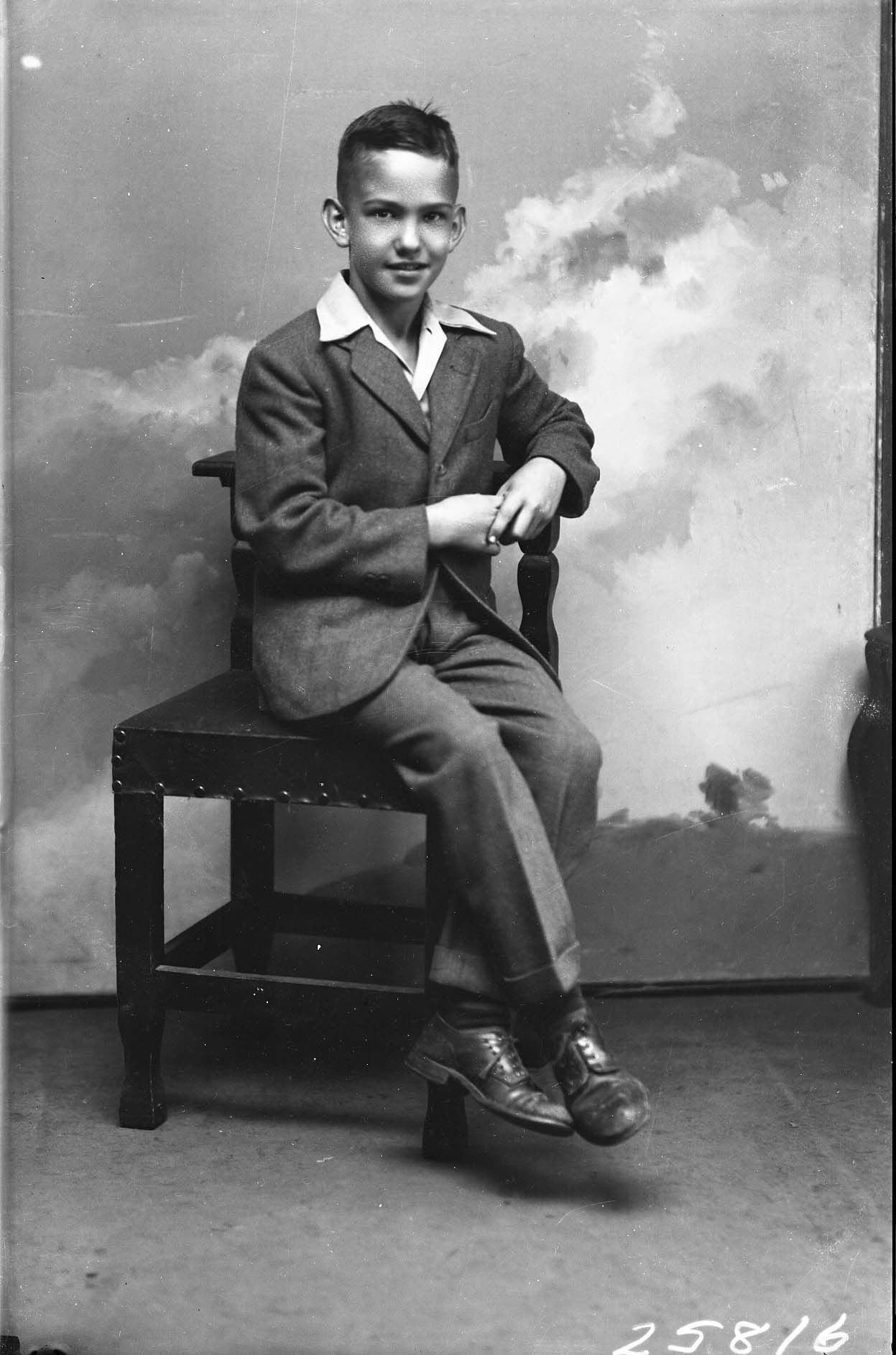 Unidentified boy is wearing a suit and tie and is seated on a chair with his ankles crossed.