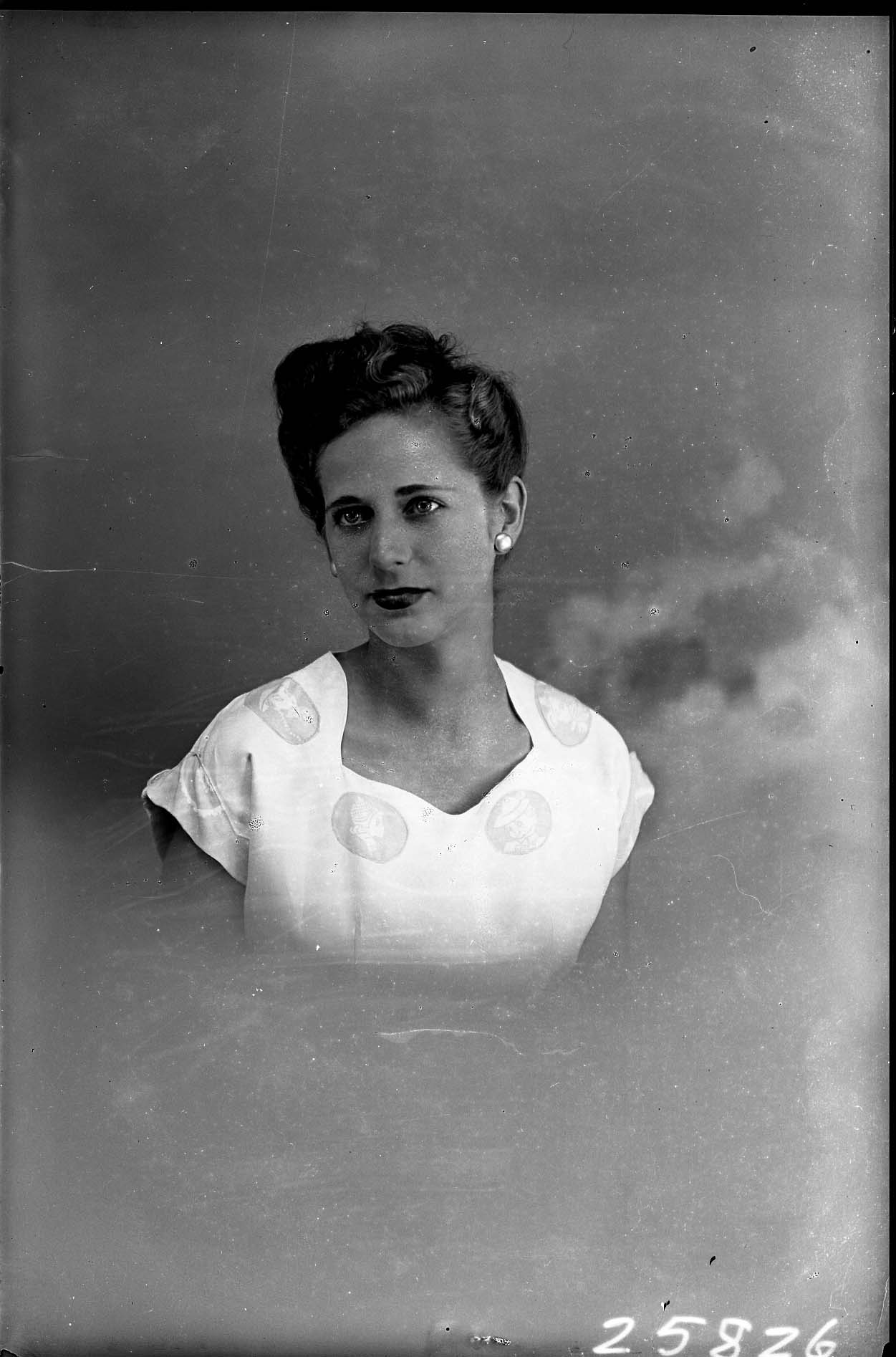 Portrait photograph of an unidentified woman with styled hair and wearing a short-sleeved dress.