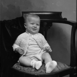 Unidentified young blond child is wearing a knit sweater and seated on a chair.