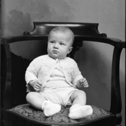 Unidentified young child is wearing a knit sweater and seated on a chair.