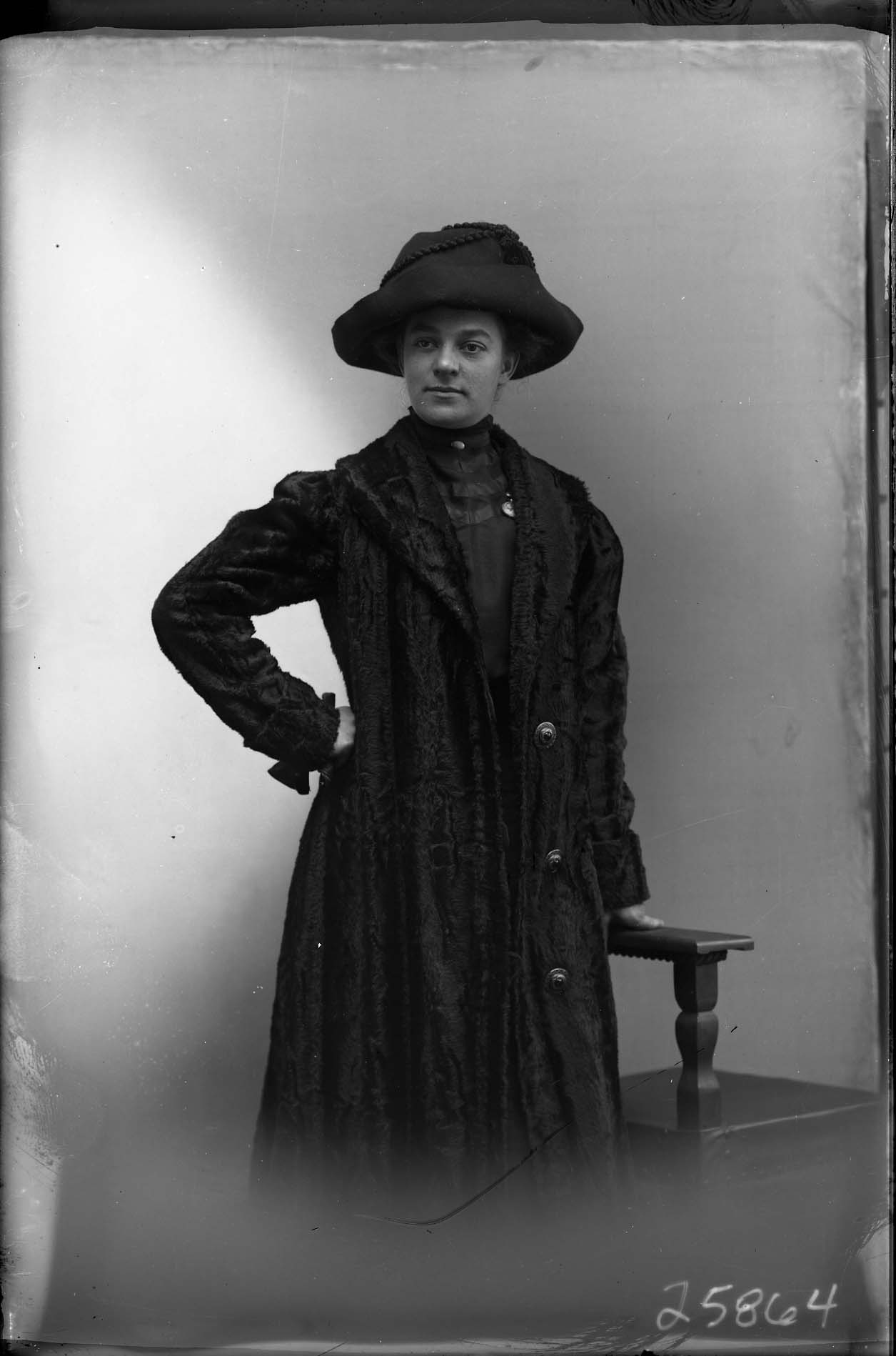 Unidentified woman in a hat and long coat, is standing by a chair with one hand on her hip.