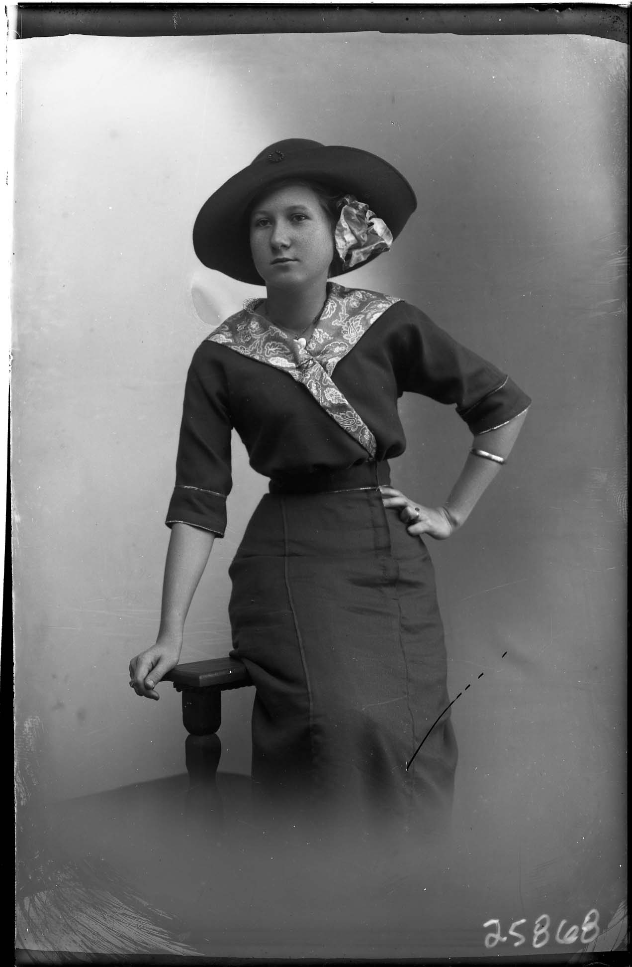 Unidentified woman in a hat is posed on the arm of a chair with one hand on her hip.