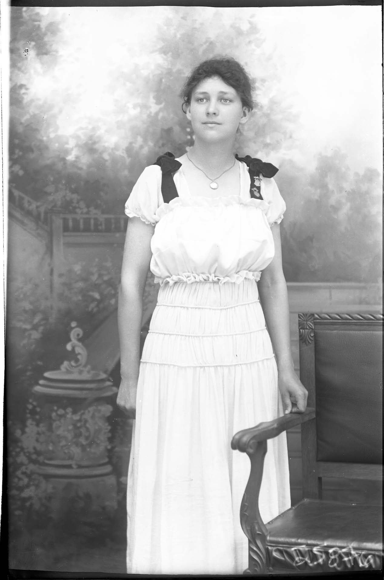 Unidentified young woman with her hair pulled back and wearing a dress with dark-colored bows on each shoulder, is standing by a bench. She is wearing a necklace and two pins are visible on her left shoulder.
