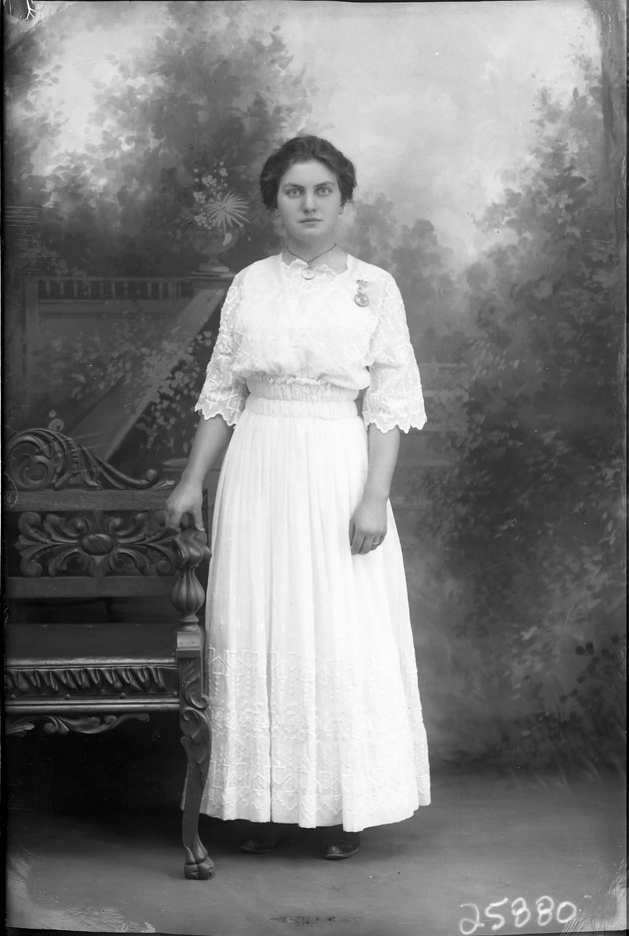 Unidentified young woman is standing by a bench and wearing a neck and pocket watch or locket pinned to her dress.