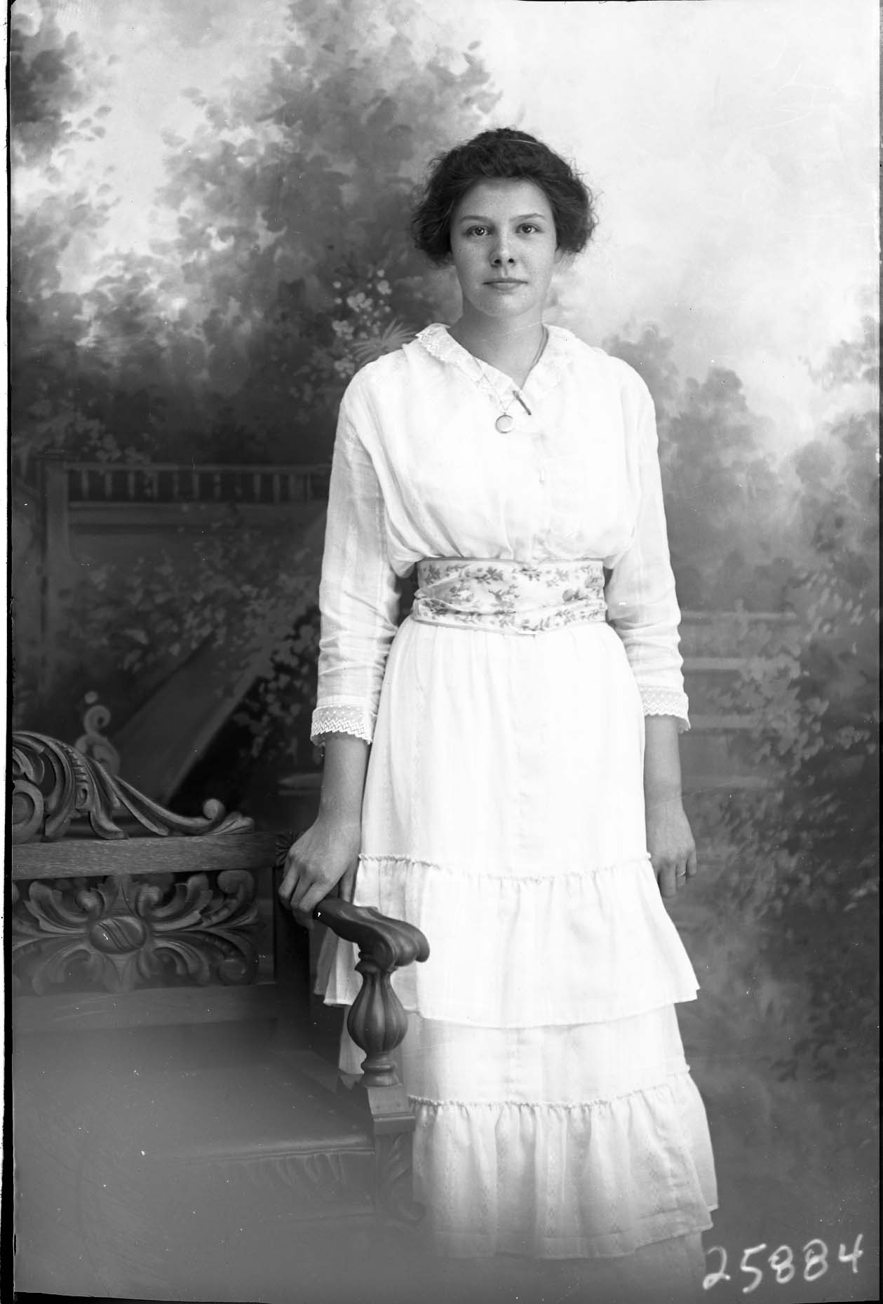Unidentified young woman standing by a bench with her hair pulled back and wearing a locket with her dress.