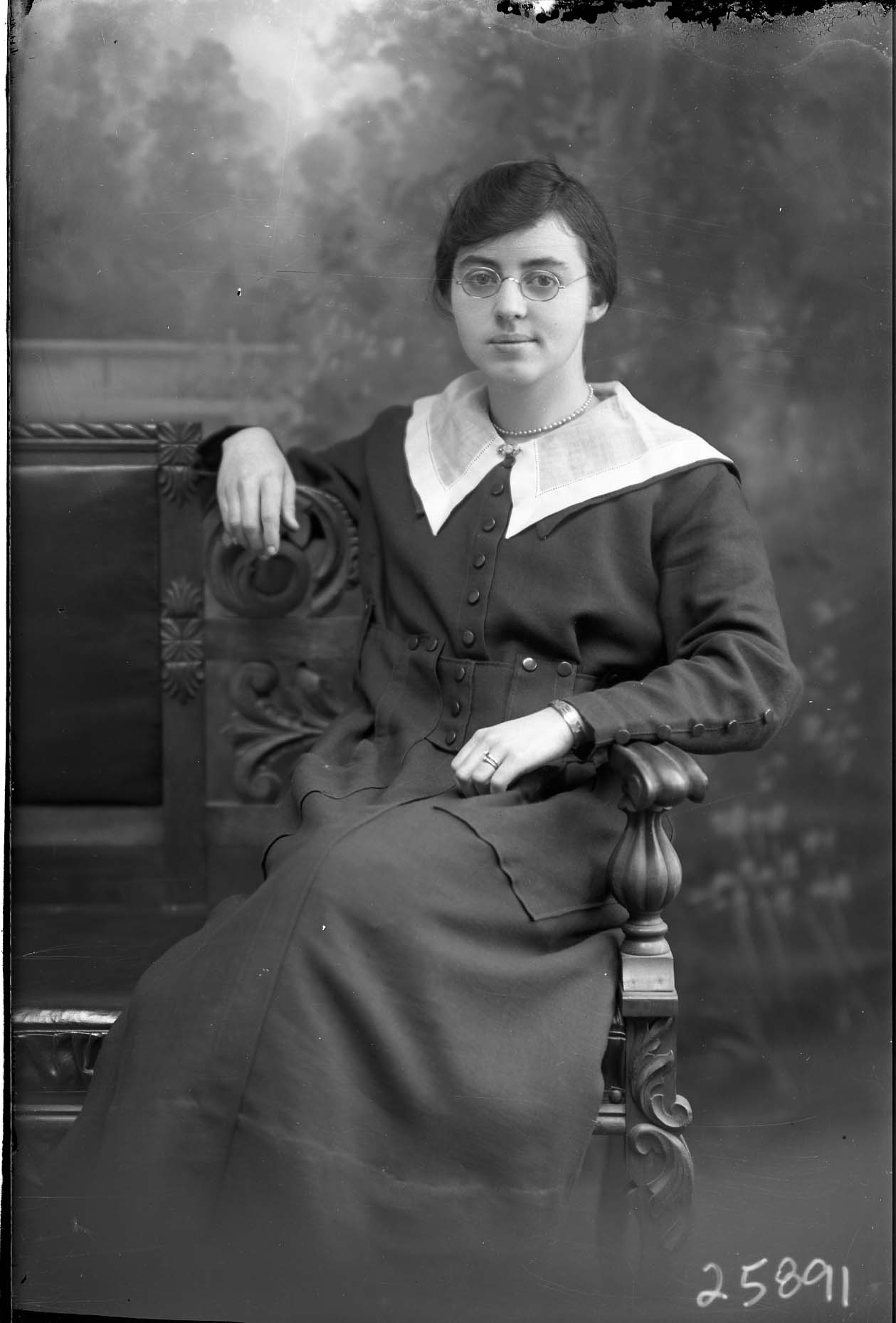 Unidentified woman is wearing glasses and a dress with a wide collar. She is posed seated on a bench with one arm over the back of it. Her legs are crossed.
