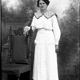 Unidentified woman is standing by a chair and wearing a dress with a wide, patterned, collar.