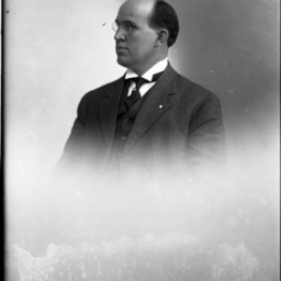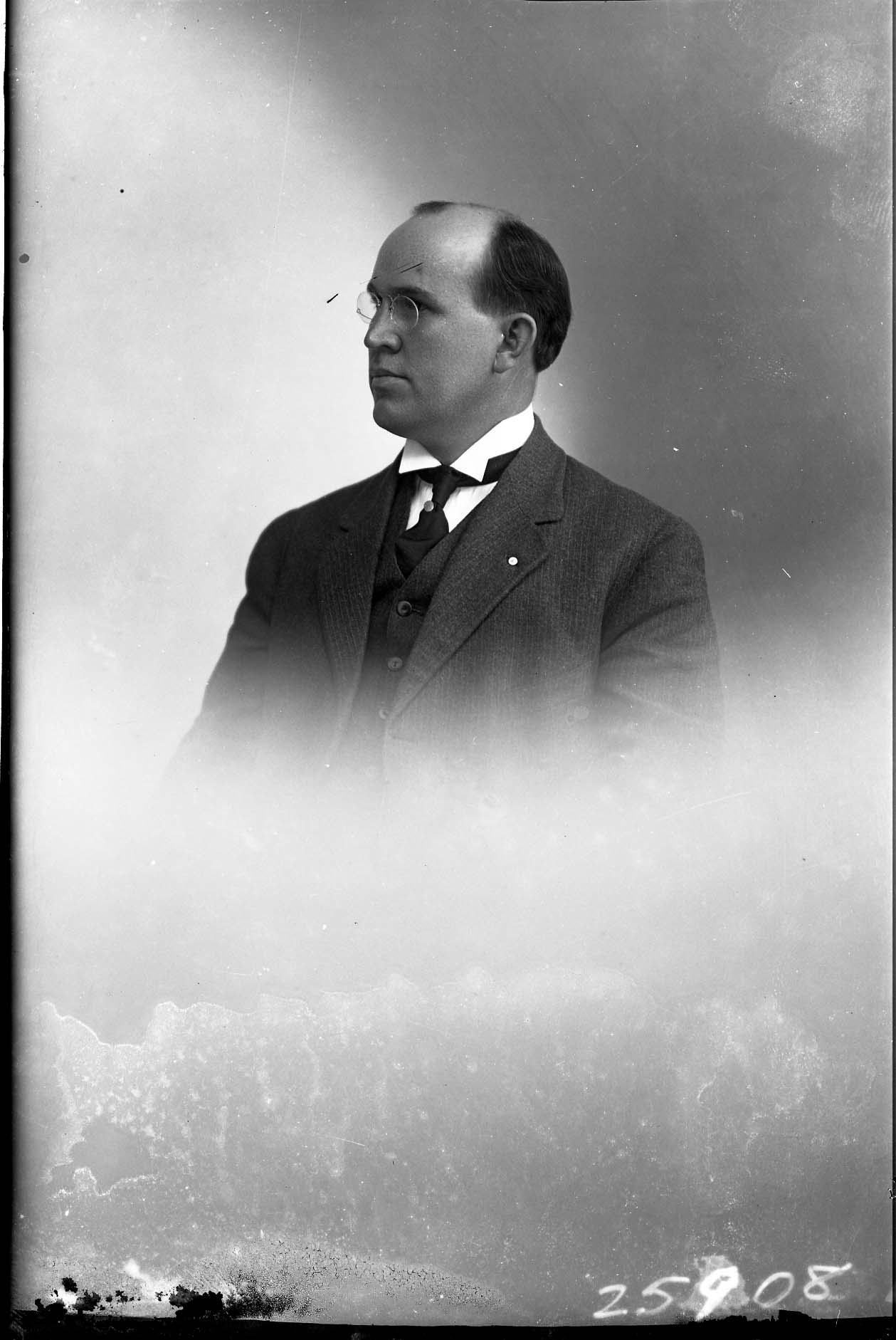 Portrait photograph of an unidentified man with glasses wearing a suit and tie.