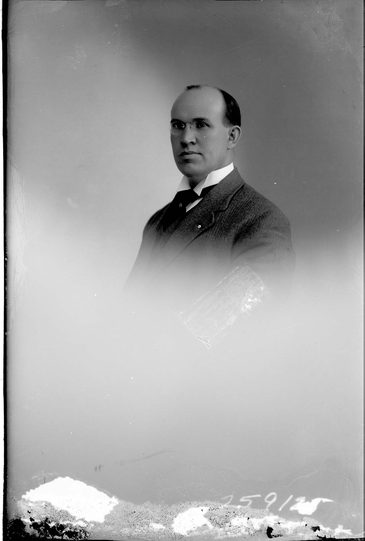 Portrait photograph of an unidentified man with glasses and wearing a suit and tie with a starched collar.