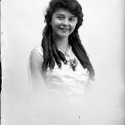Portrait photograph of an unidentified young woman with long curls in her hair and wearing a necklace and corsage.