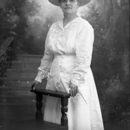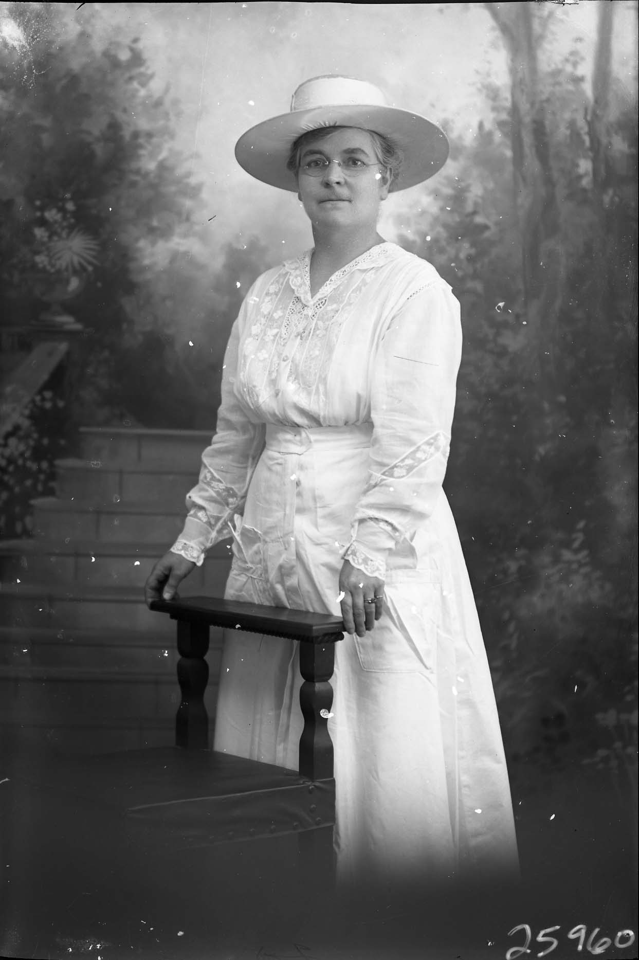 Unidentified woman in glasses and wearing a wide-brimmed hat, is standing by a chair.