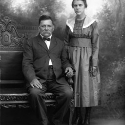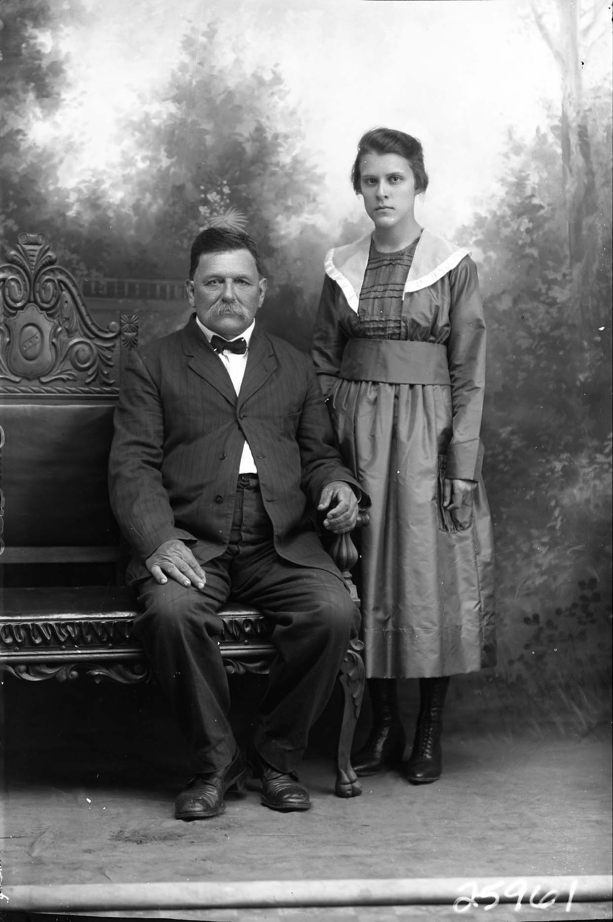 Unidentified older man with a mustache and bow tie is seated beside an unidentified young woman wearing a long-sleeved dress.