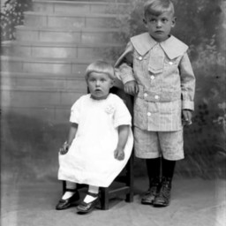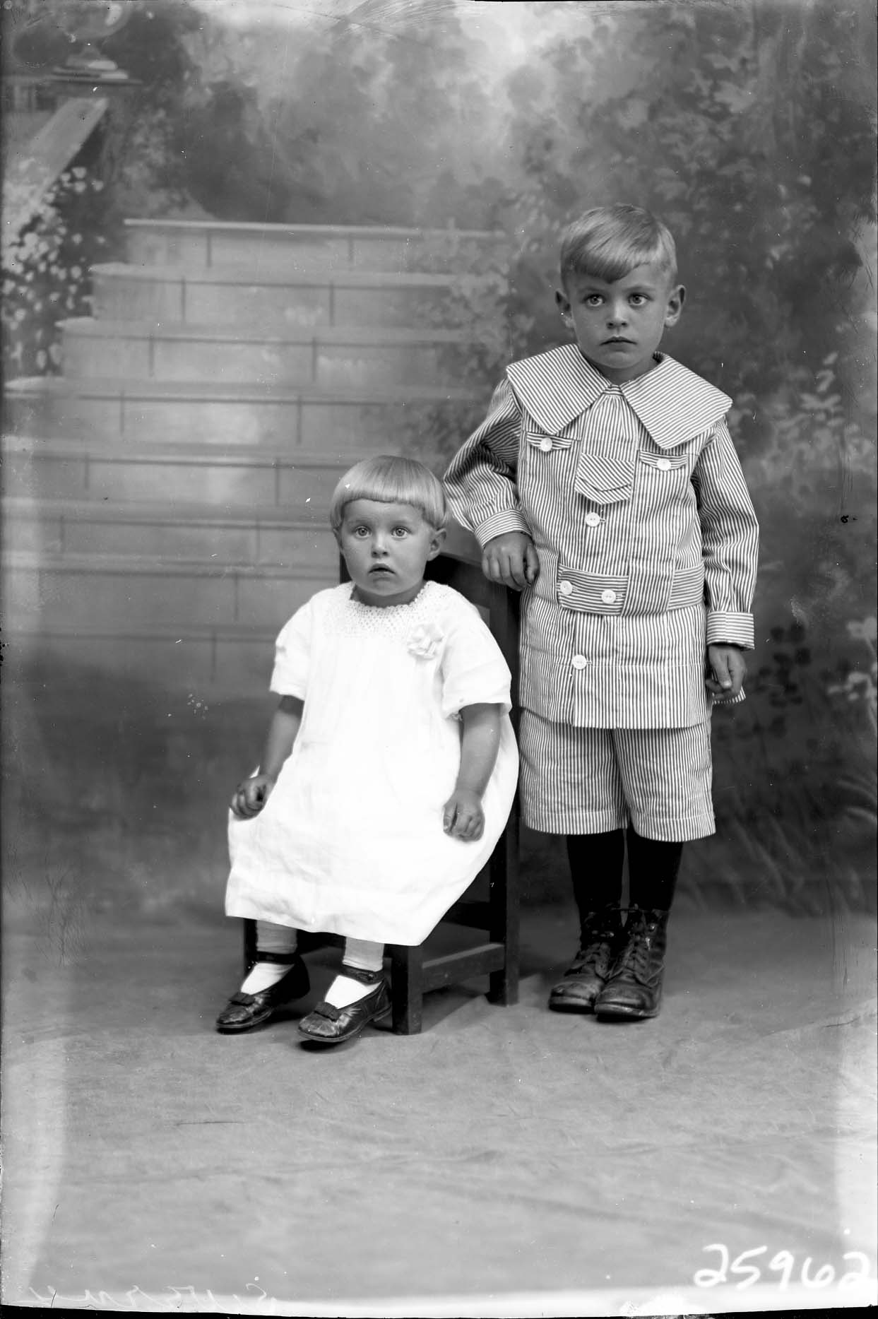 Two unidentified young children, one seated on a child-sized chair and an older boy standing, are posed together.