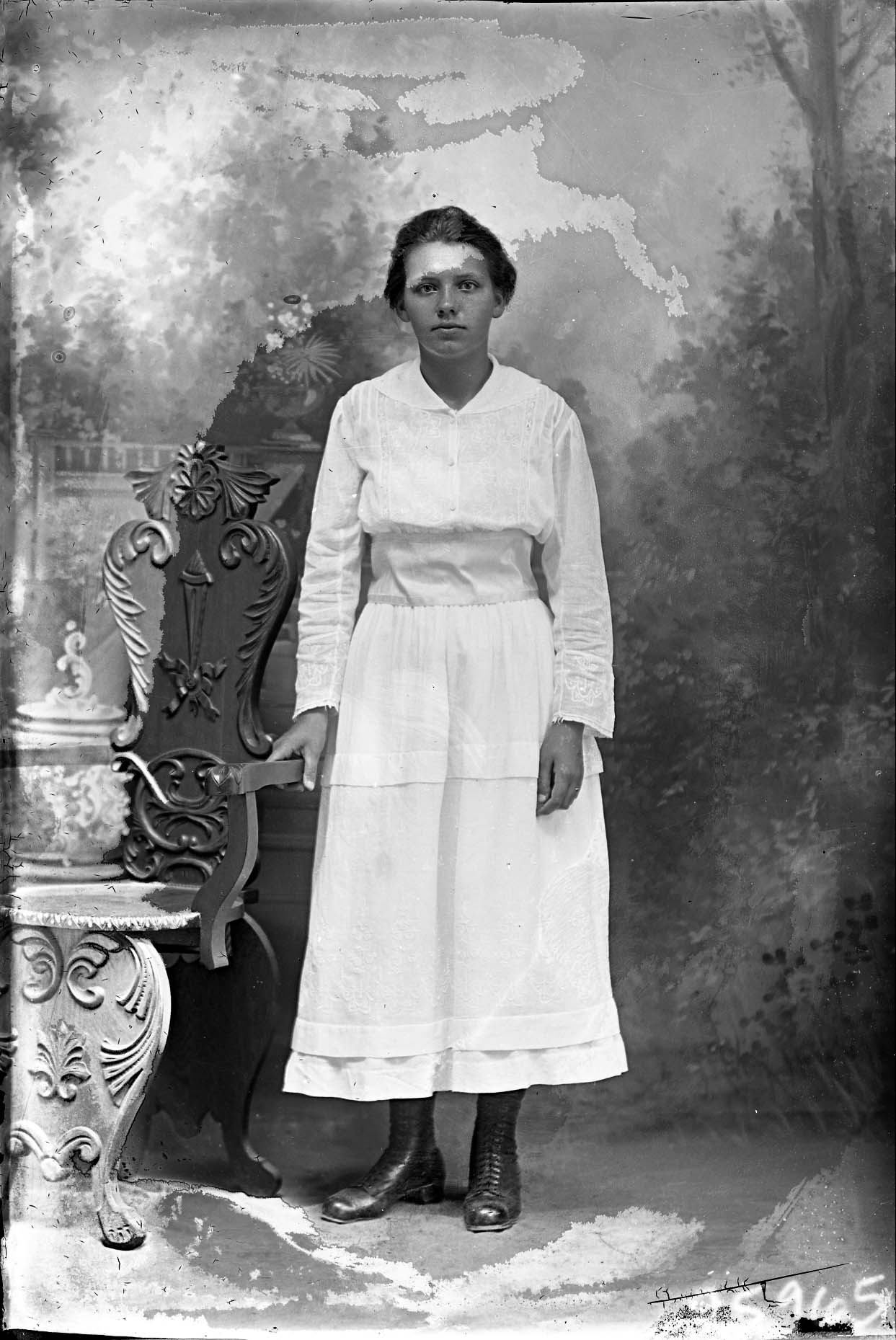 Unidentified young woman with her hair pulled back is standing beside a chair and wearing a long-sleeved dress.