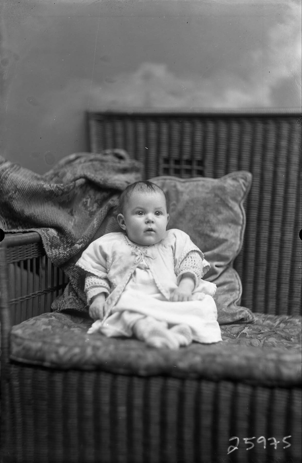 Unidentified yung child is propped against a pillow on a wicker bench.