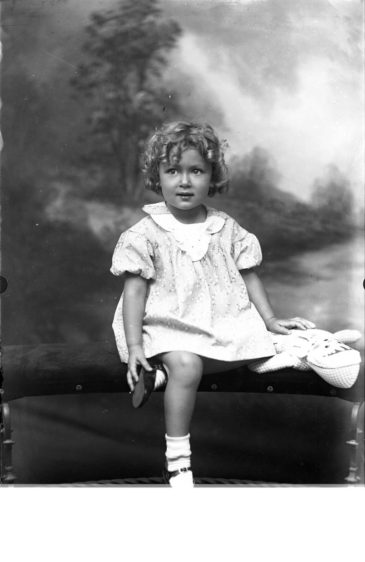Unidentified girl with curly short hair is seated on a bench with one leg tucker under the other one and a doll by her side.