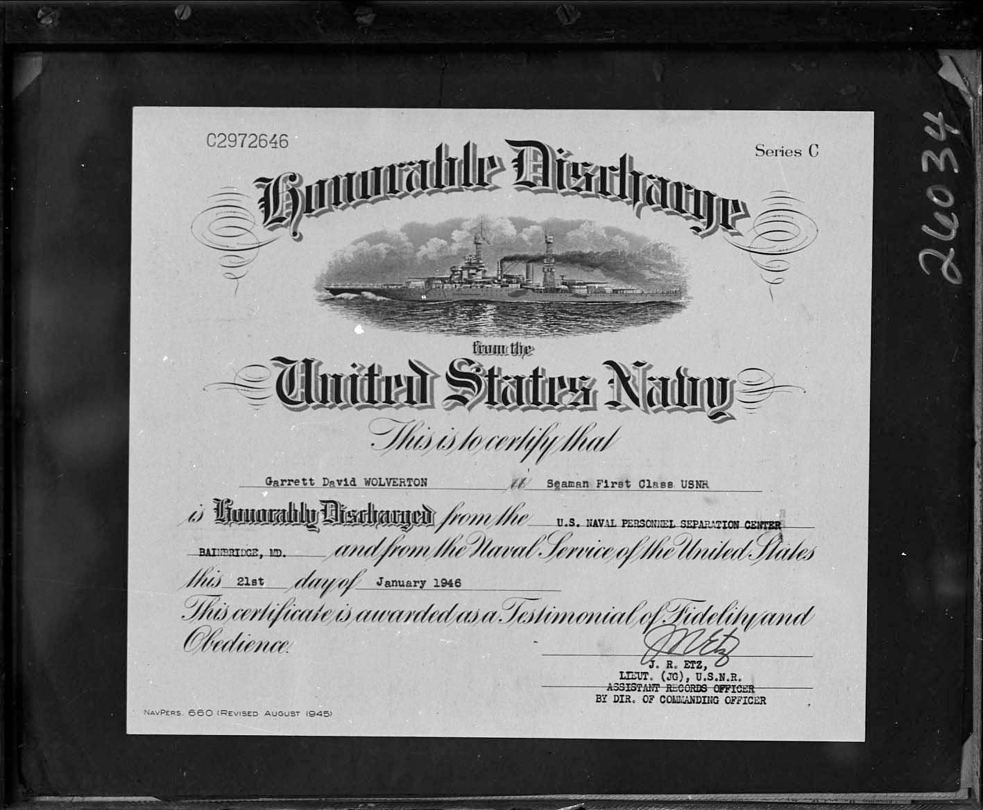 Photograph of the document certifying that Seaman First Class Garrett David Wolverton was honorably discharged from the Navy in Bainbridge, Maryland, on January 21, 1946.
