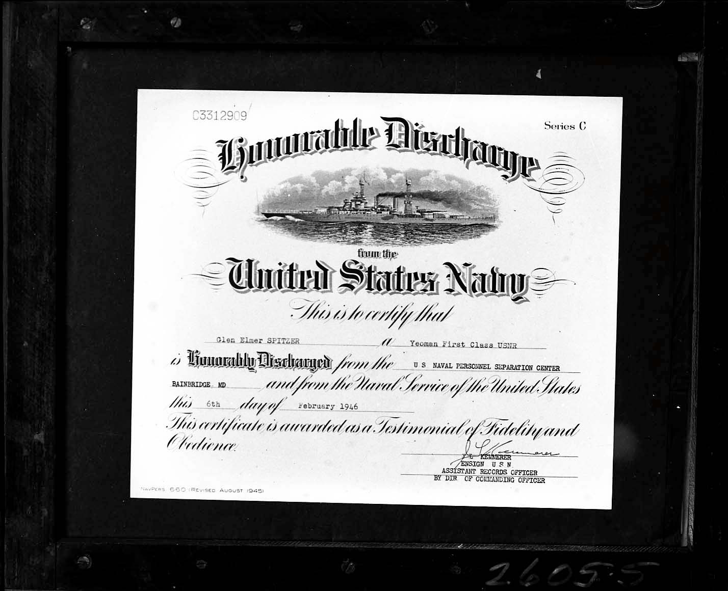 Photograph of the document certifying that Yeoman First Class Glen Elmer Spitzer was honorably discharged from the Navy in Bainbridge, Maryland, on February 6, 1946.