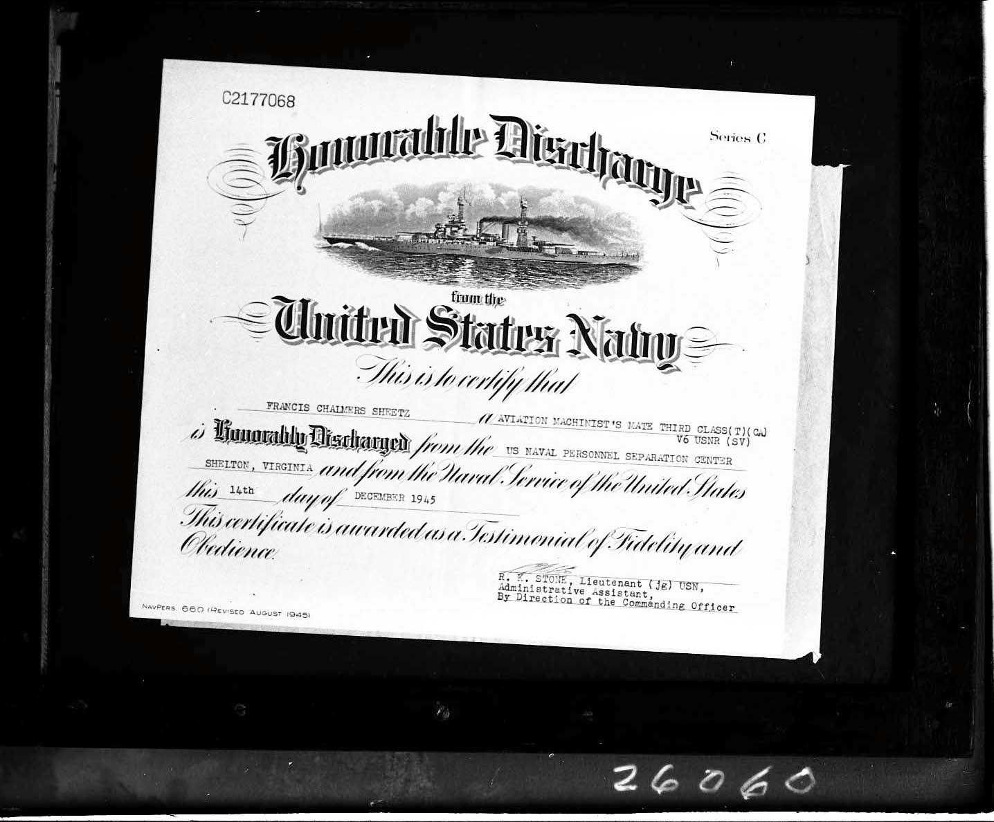 Photograph of the document certifying that Aviation Machinist's Mate Third Class Francis Chalmers Sheetz was honorably discharged from the Navy in Shelton, Virginia, on December 14, 1945.
