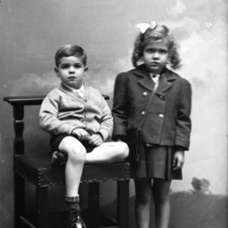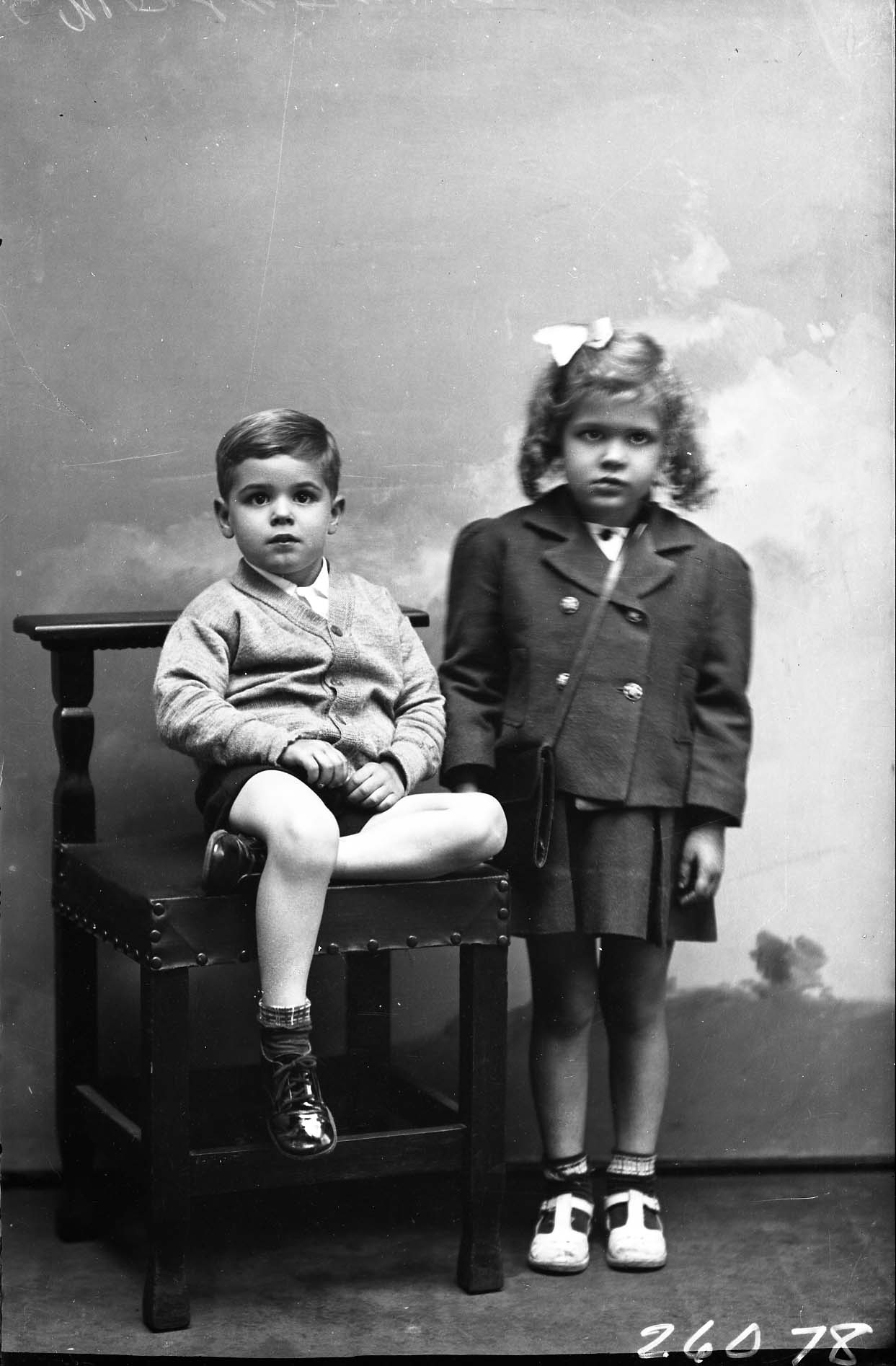 Two unidentified young children, a boy and an older girl with a bow in her curly hair, are posed together.