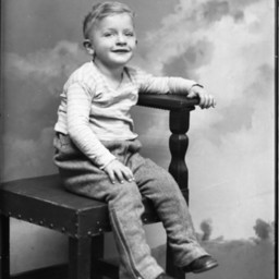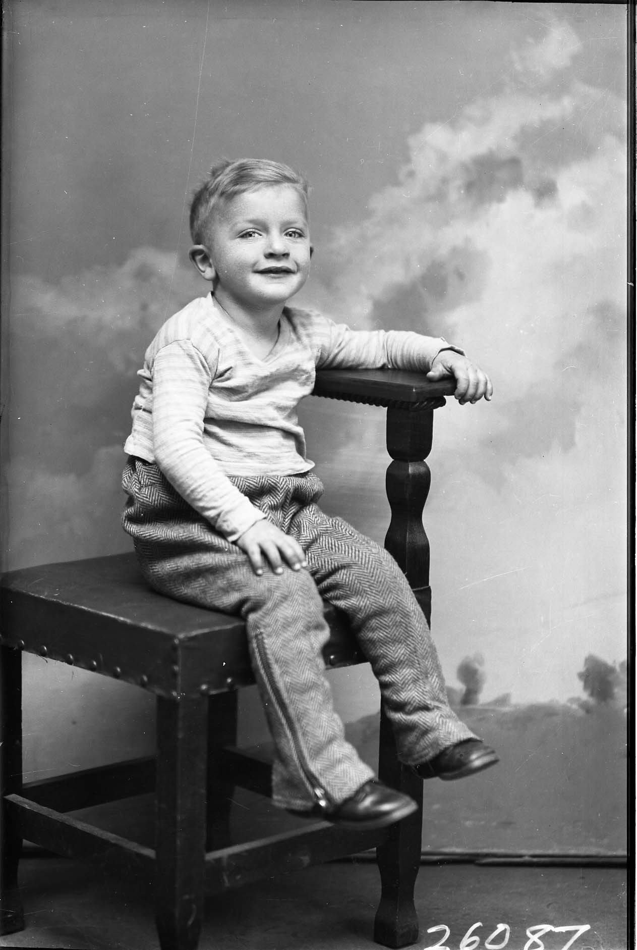 Unidentified young blond boy is seated on a chair.