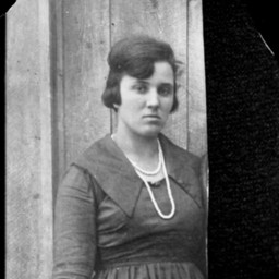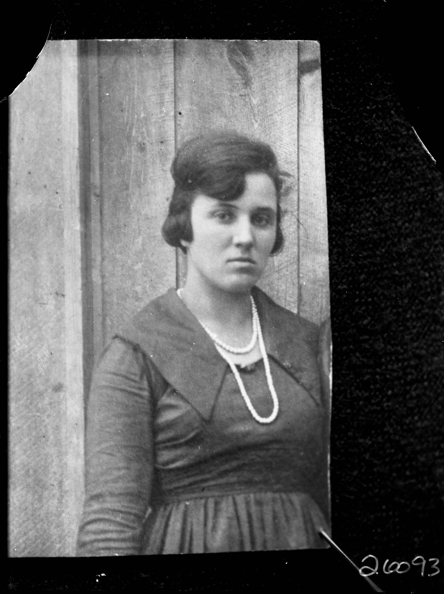 Photo of a photograph of an unidentified woman standing outdoors and wearing a necklace.