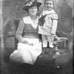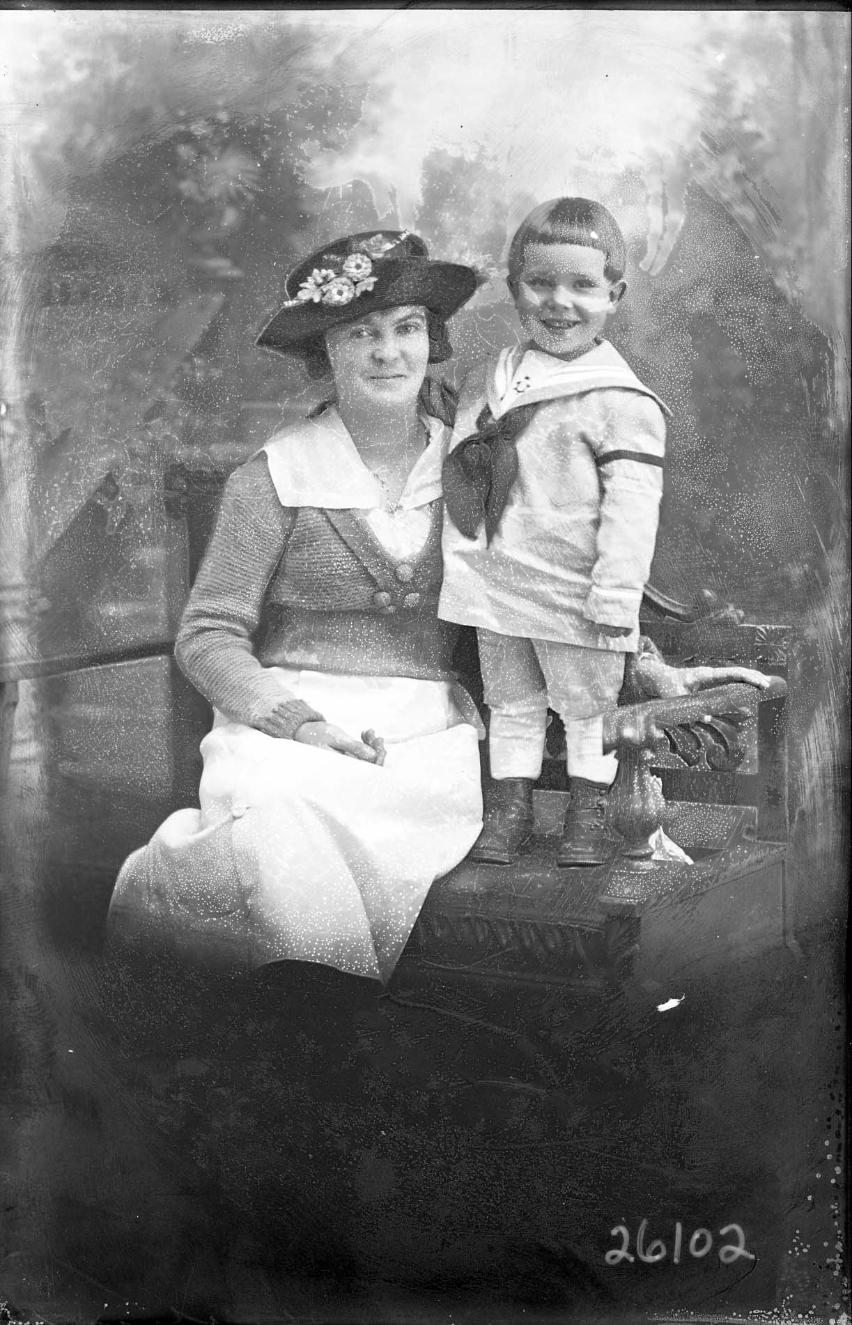 Unidentified woman in a hat decorated with flowers is seated beside an unidentified young child who is standing and wearing a sailor-themed outfit.