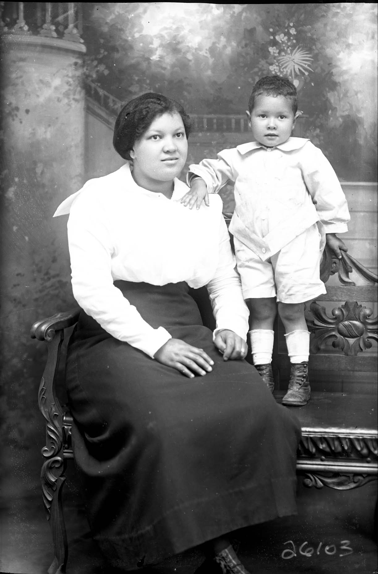 Unidentified African American woman is seated on a bench with an unidentified young boy standing beside her.