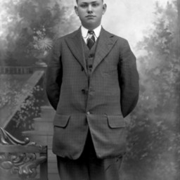 Unidentified young man is wearing a suit and tie and standing with both hands behind his back.