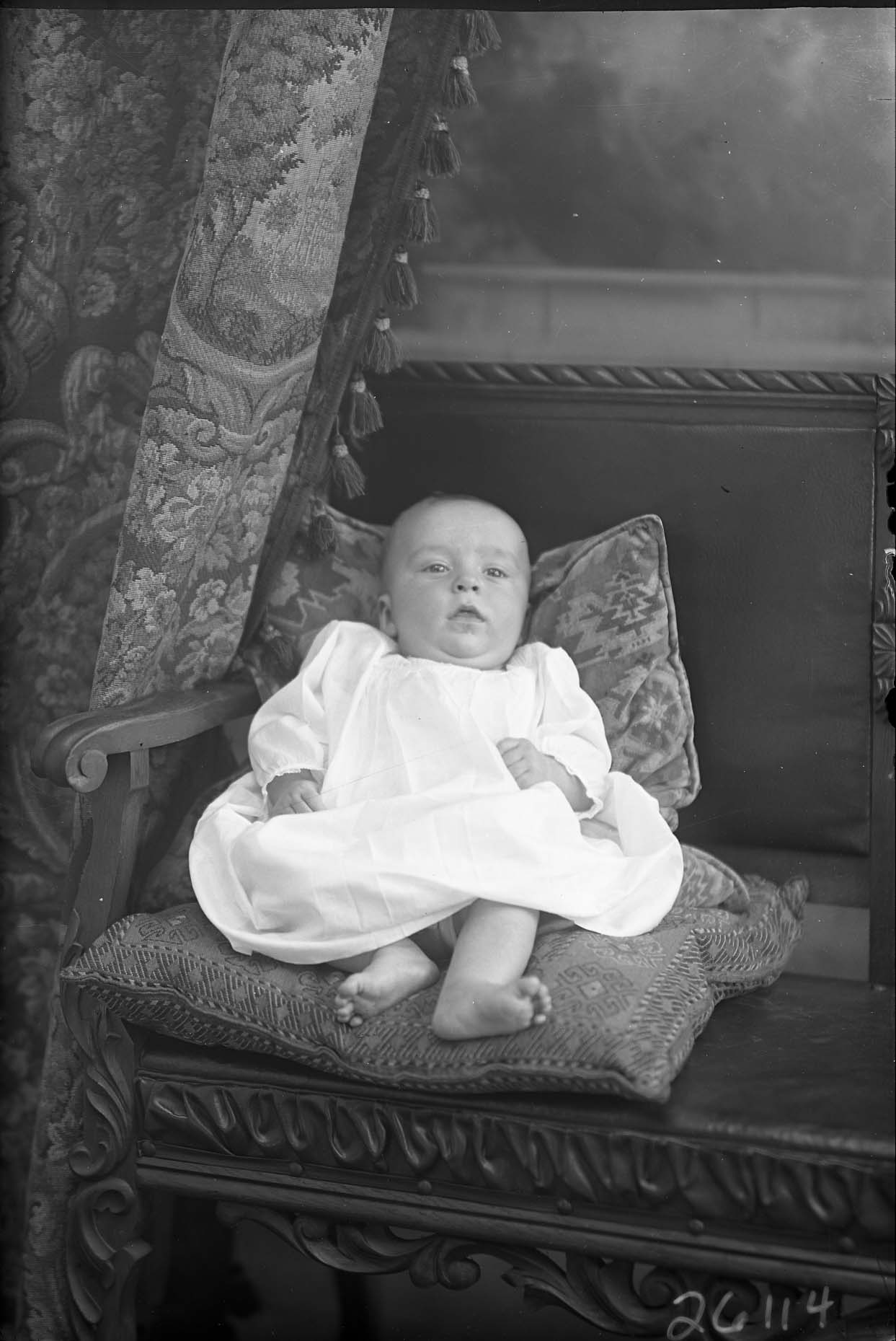Unidentified barefoot baby is posed against pillows on a bench.