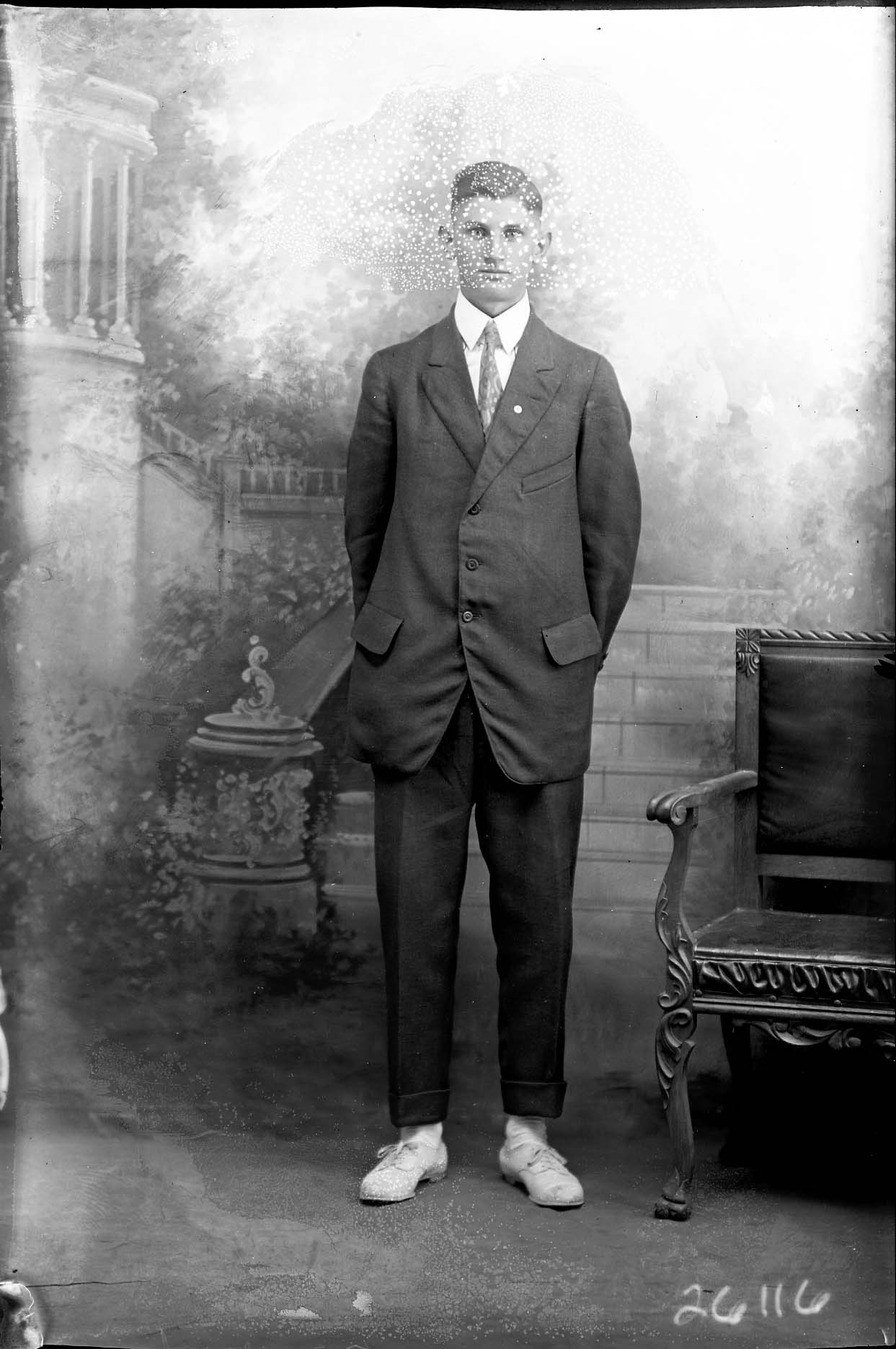 Unidentified young man wearing a suit and tie is standing by a chair.