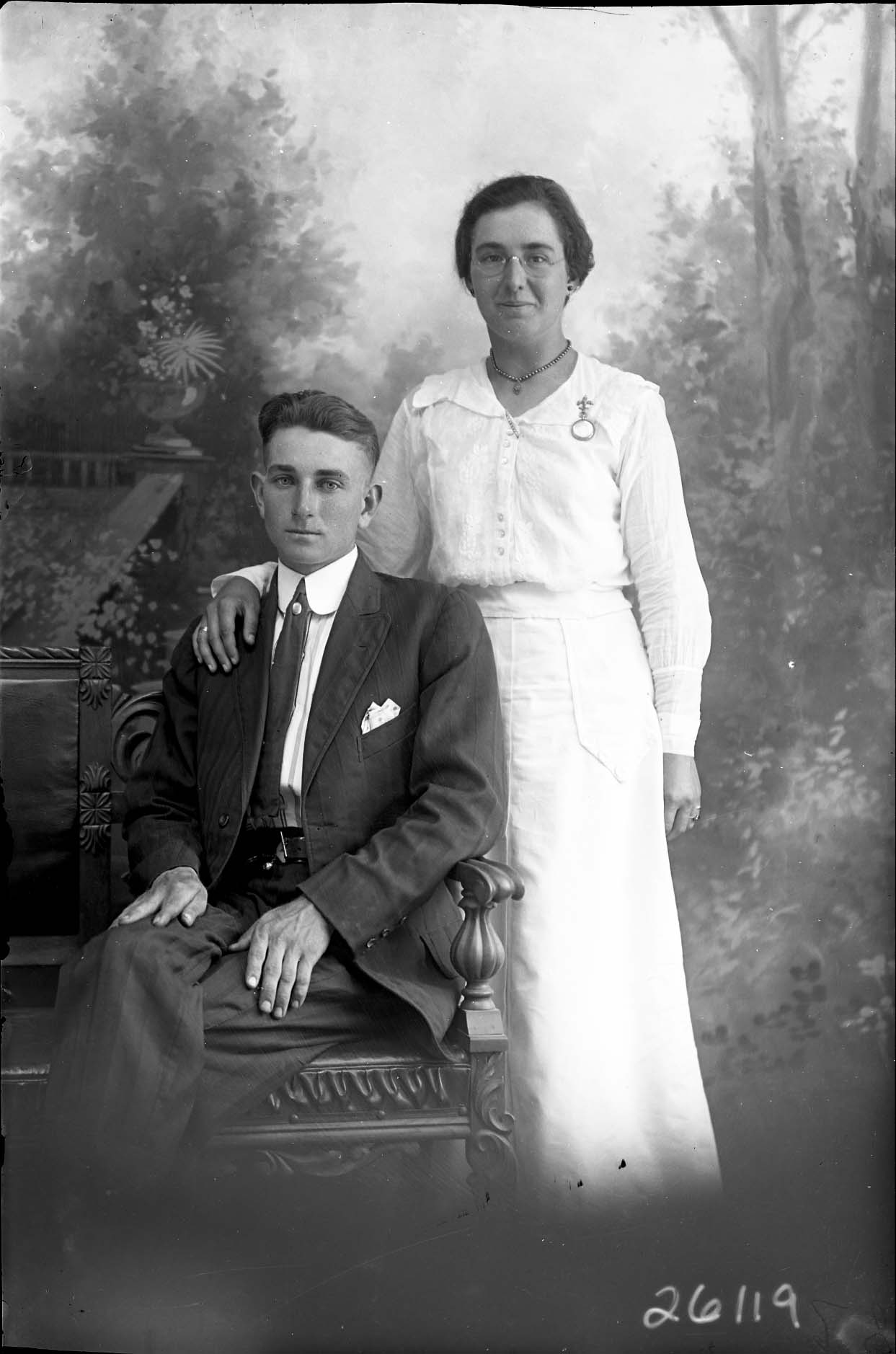 Unidentified man in a suit and tie with a starched collar is seated on a bench with his legs crossed. An unidentified woman with glasses and a watch or locket pinned to her dress is standing beside him with her hand on his shoulder.
