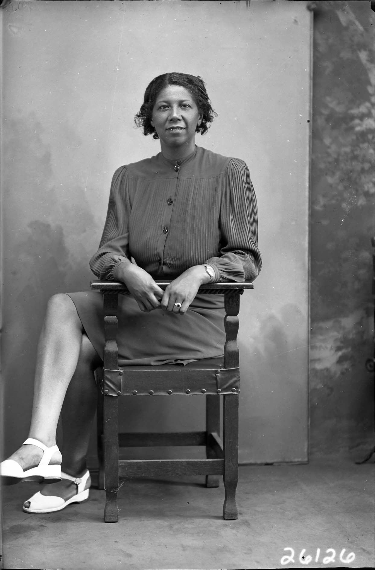 Unidentified African American woman is seated on a chair with her legs crossed.
