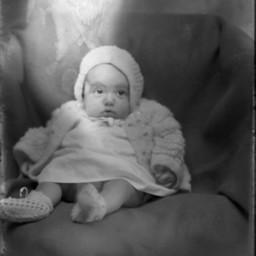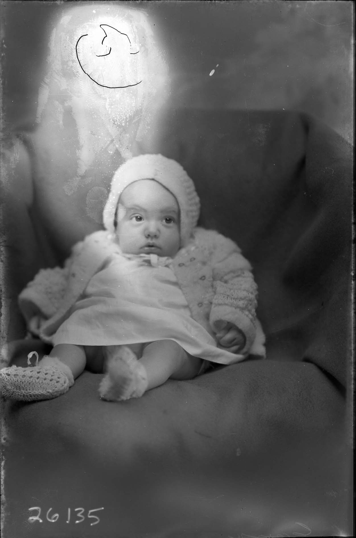 Unidentified baby wearing a knit sweater and hat, is propped against a covered chair.