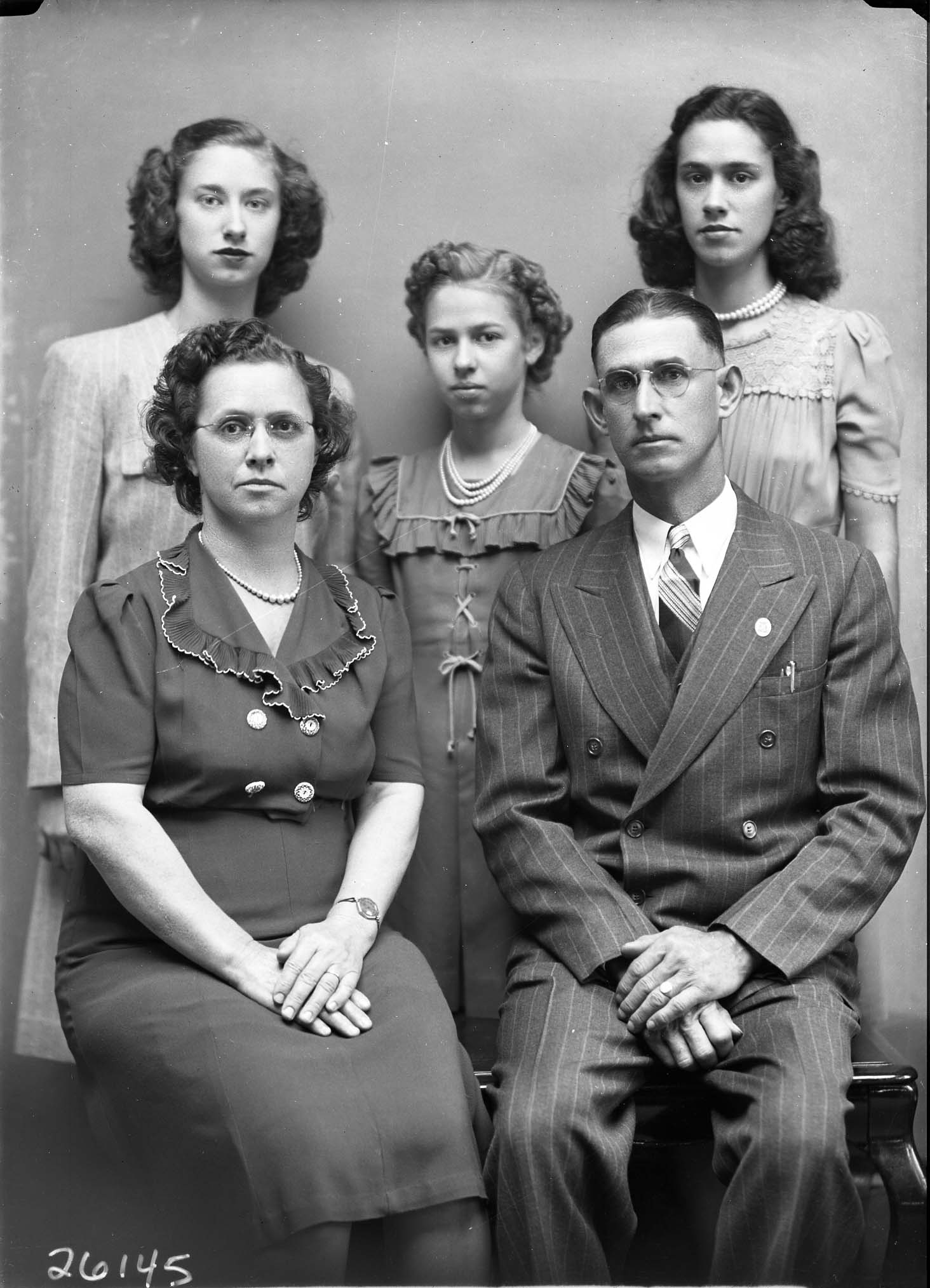 Photograph of Golda Mae (Hottle) Wisman and her husband, Clarence L. Wisman, both seated. Behind them are their three daughters identified as (l to r): Jean Elizabeth (Wisman) Artz, Betty Ann (Wisman) McCoy, and Louise Virginia (Wisman) Carter.
