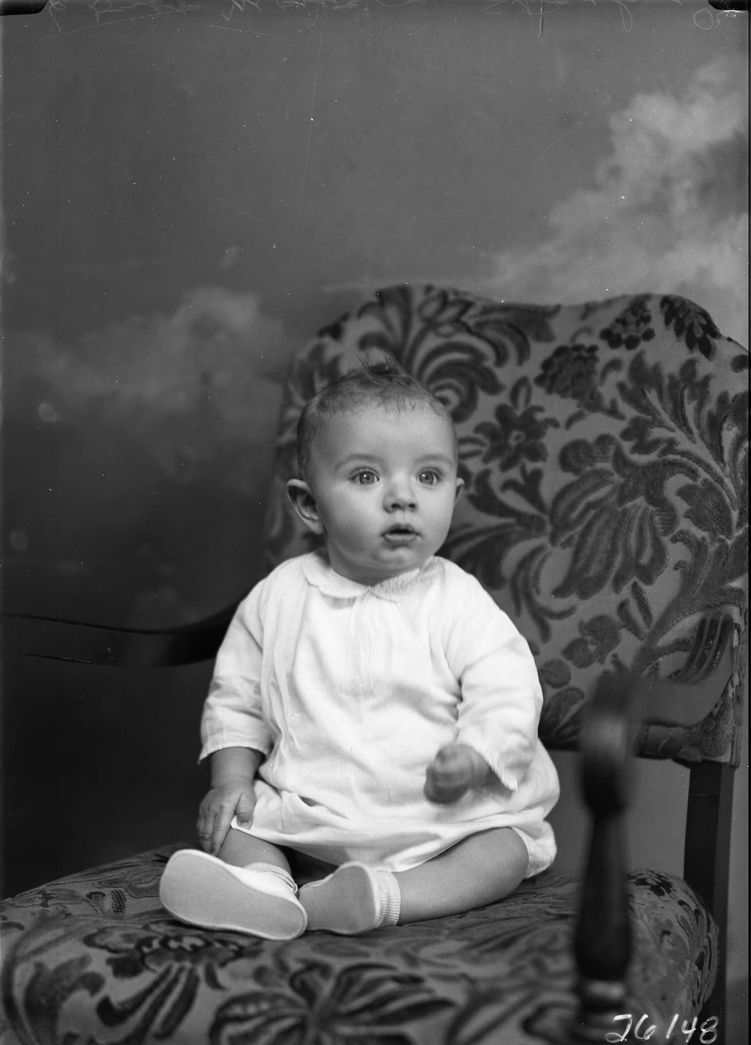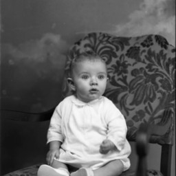 Unidentified young child is seated on a chair.
