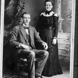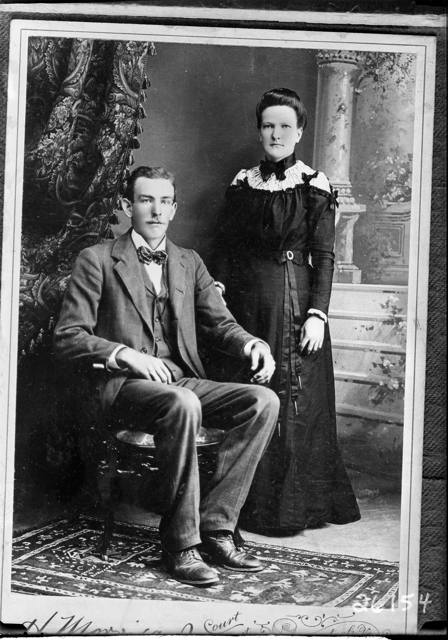 Photo of a photograph of an unidentified young man in a bow tie, seated, with an unidentified woman in a long dress standing beside him.