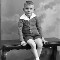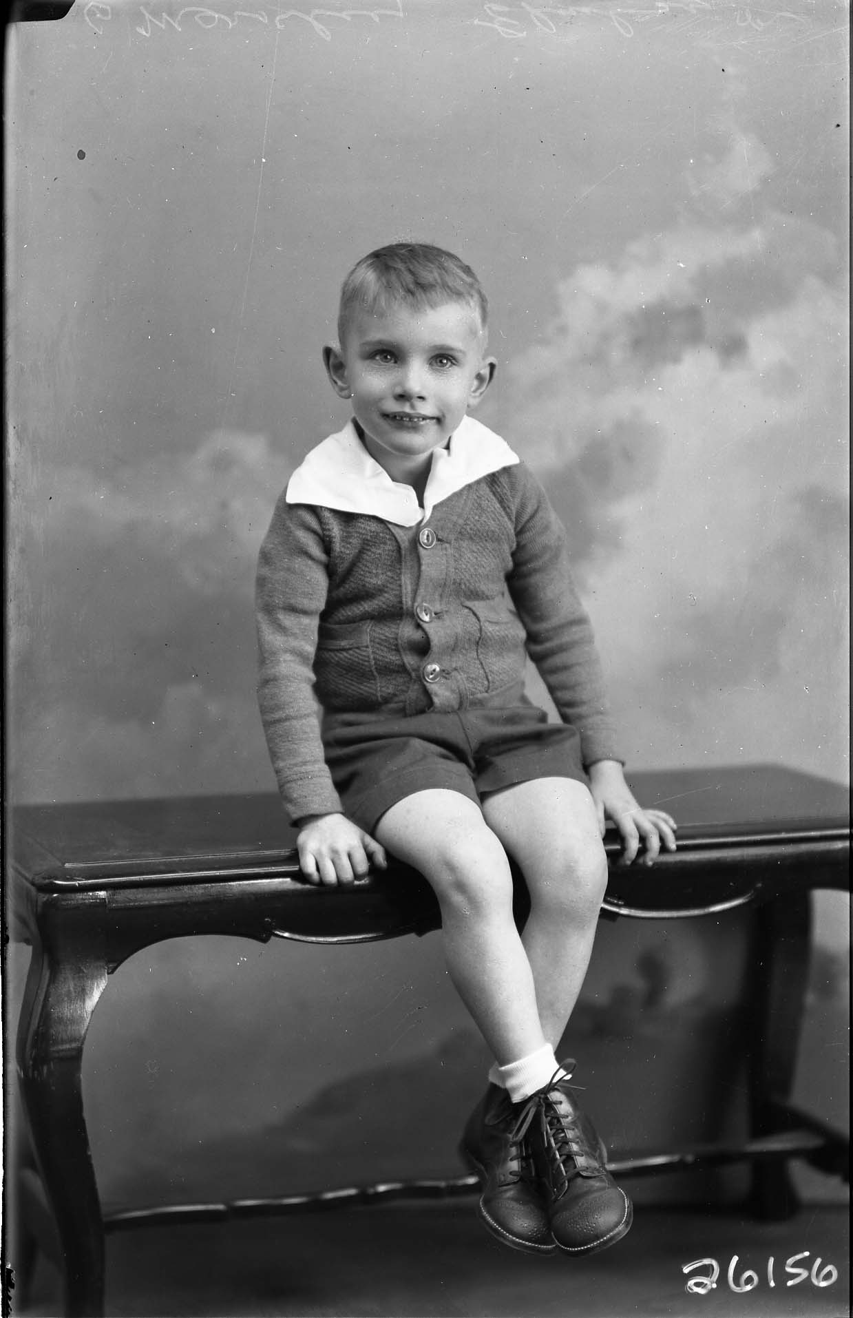 Photograph of Richard Merkley as a young boy and seated on a bench with his ankles crossed.