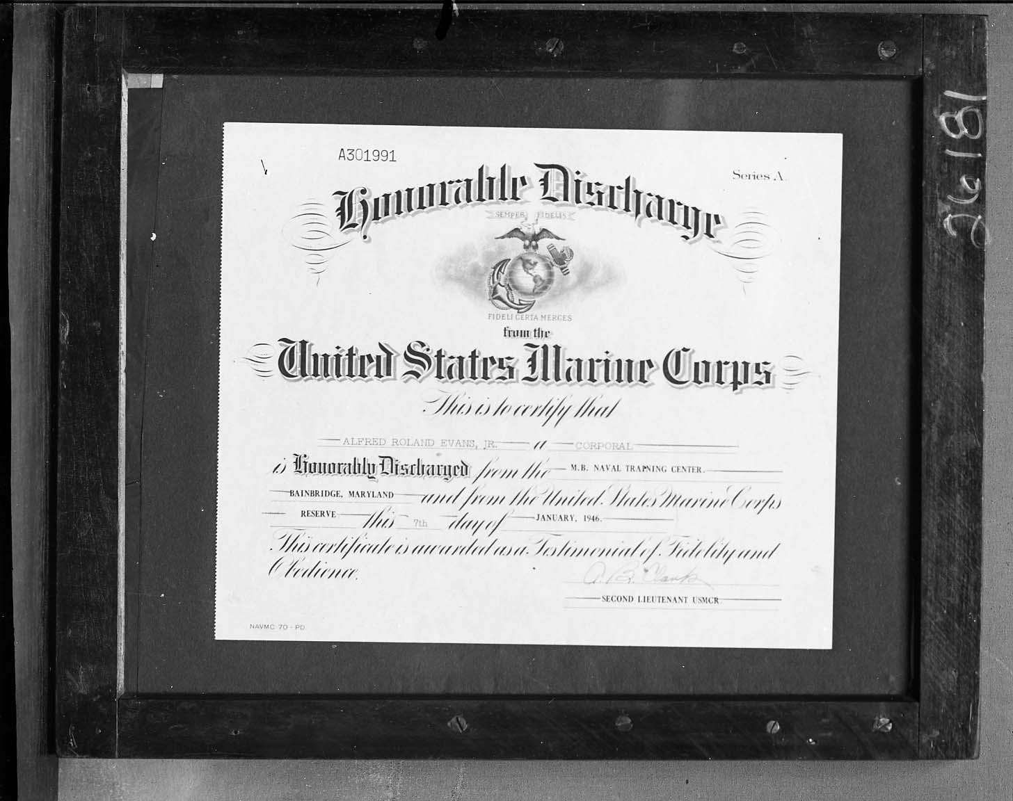 Additional paperwork related to Alfred Roland Evans, Jr.'s Discharge from the USMC appears in Morrison Studio Collection number 025412.