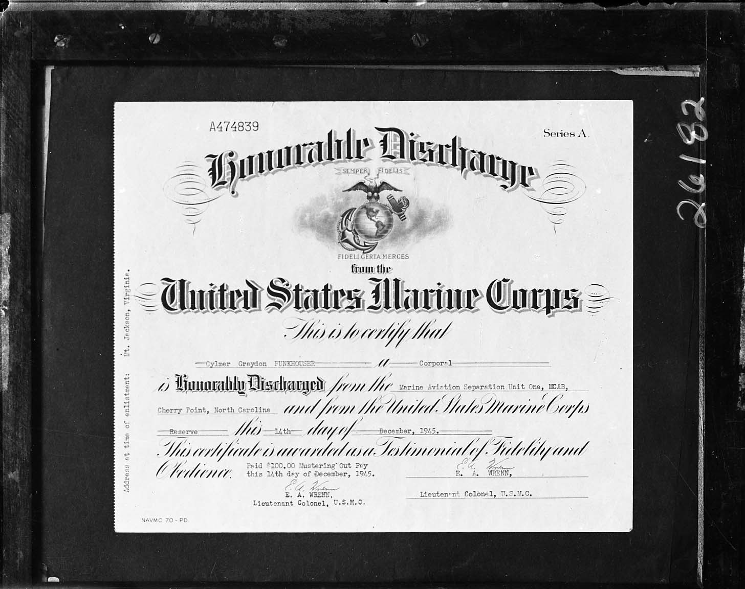 Morrison Studio, “Cylmer Graydon Funkhouser's USMC Discharge Certificate,” Shenandoah County Library Archives, accessed December 5, 2025, https://archives.countylib.org/items/show/55854.