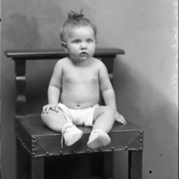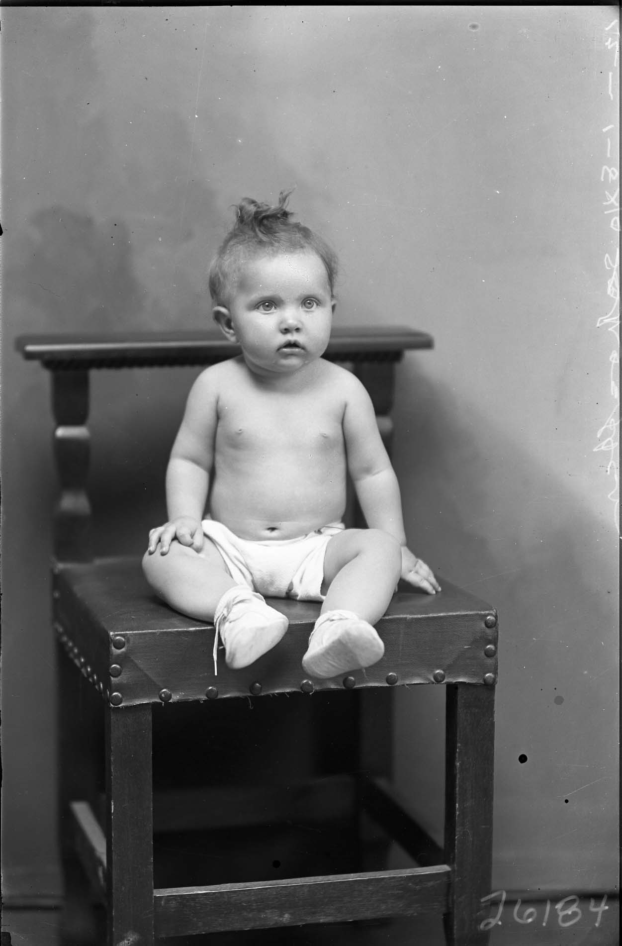 Unidentified young child wearing only a diaper and shoes, is seated on a chair.