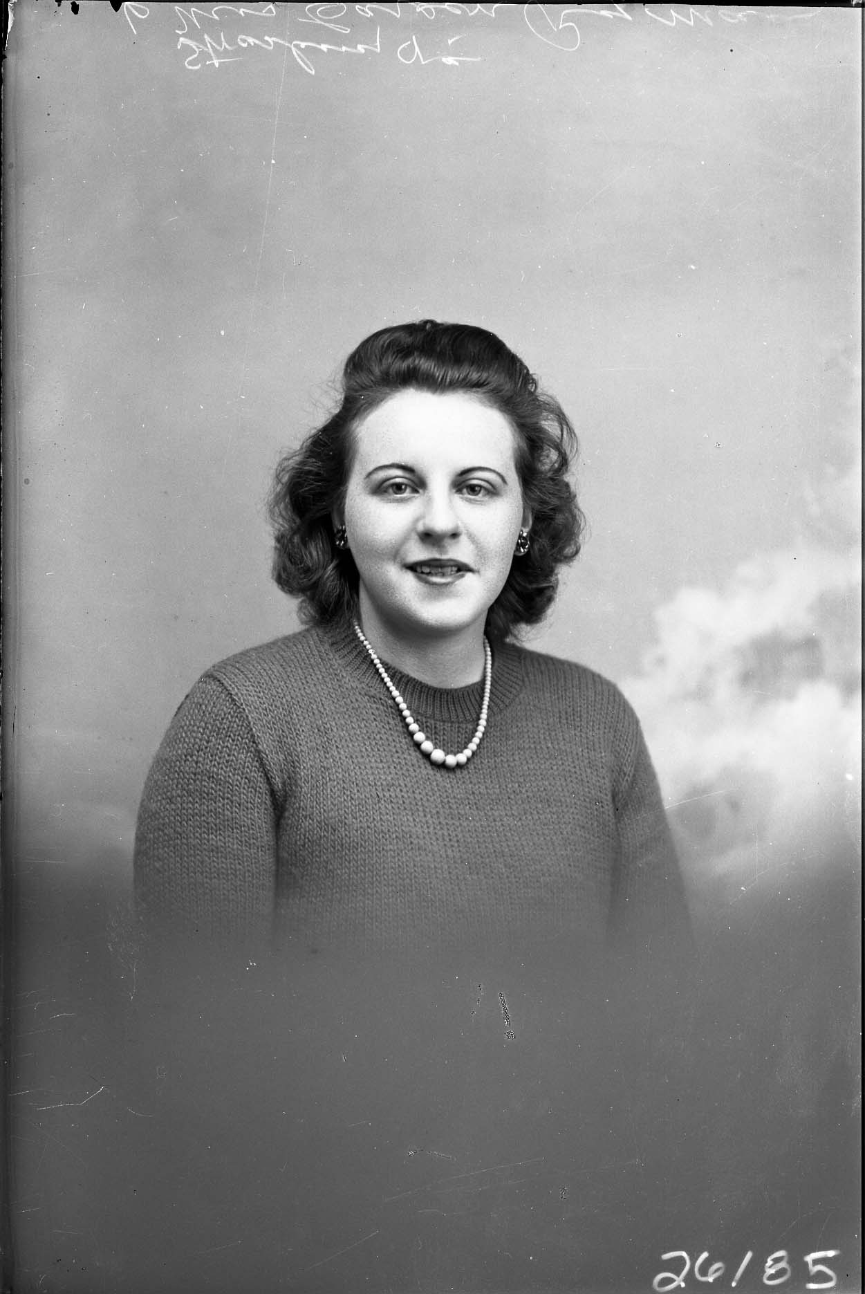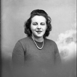 Portrait photograph of an unidentified woman wearing a faux pearl necklace with her sweater.