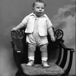 Unidentified toddler wearing a short jacket is standing on a chair.