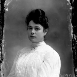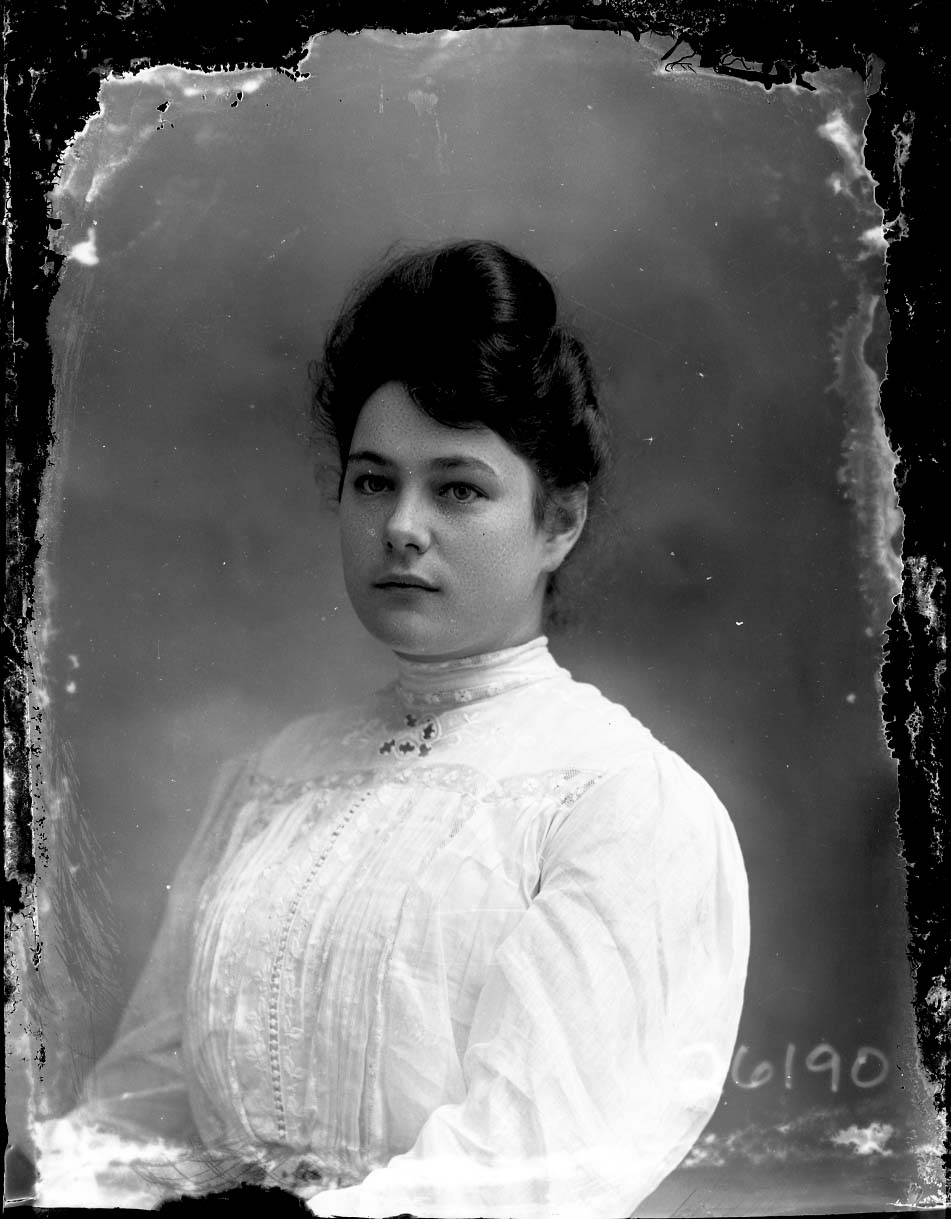 Portrait photograph of an unidentified woman with her hair styled up and wearing a blouse with a high collar.
