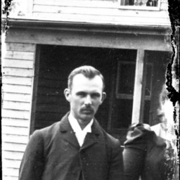 Unidentified man is standing in front of a house outdoors. Part of an unidentified woman is visible beside him.