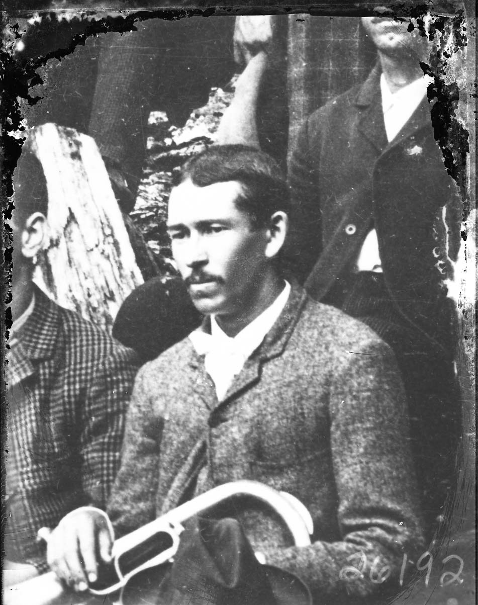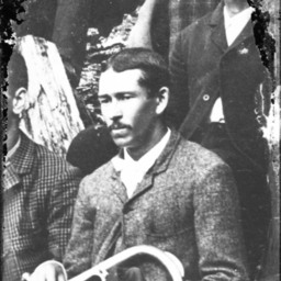 Photo of a photograph of an unidentified man with a mustache is shown holding a musical instrument.