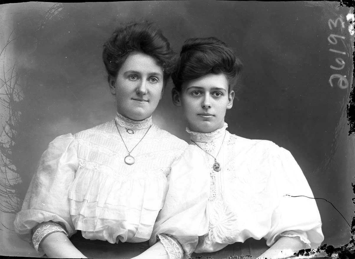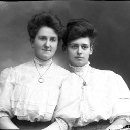 Both have their hair styled up and are wearing necklaces or lockets with their high-collared blouses.
